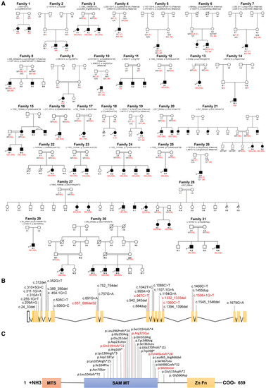 Genetic pedigrees of the reported individuals with homozygous TRMT1 variants (A) Pedigrees of the families described. Squares, males; circles, females; black symbols, affected individuals; white symbols, unaffected individuals. Double lines indicate consanguinity. The text below each affected individual describes their alleles with variant alleles in red. (B) Coding exons of the TRMT1 mRNA with variants noted. (C) Schematic indicating the domains of the TRMT1 protein. The red box represents the mitochondrial targeting signal (MTS), while the blue box indicates the class I S-adenosyl-methionine-dependent methyltransferase (SAM MT) domain. The yellow box indicates a C-terminal bipartite nuclear localization signal embedded within a C3H1-type zinc finger (Zn Fn) motif. Variants reported in this study are represented in black, while previously reported variants are in red. |
