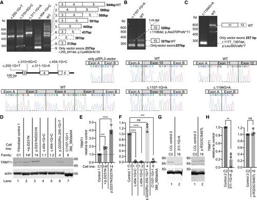 TRMT1 variants induce splicing defects and changes in TRMT1 protein levels (A) RT-PCR analysis of RNA from HEK293T cells transfected with TRMT1 minigenes. The presence of additional bands in the WT is attributed to alternative splicing and quantified in Table S7. The splicing schematic is shown for each band to the right. The variant schematic is shown below. Sanger sequencing results showing the correctly spliced WT product with the deleterious variant effect, exon skipping, shown by the presence of only pSPL3 vector. The dotted box represents the short version of exon 5. (B) RT-PCR analysis of RNA from cells transfected with the c.1107−1G>A minigene. The splicing schematic is shown for each band to the right. Exon 10 with 1-bp deletion is represented with a dotted line corresponding to the single-bp deletion. (C) RT-PCR of the c.1194G>A variant. Asterisks represent assay artifacts. The splicing schematic is to the right. Assay design captured part of exon 12 that was correctly spliced in the WT control. (D) Immunoblot of lysates from fibroblast cell lines derived from control (C1) or affected individuals. (E and F) Quantification of TRMT1 levels relative to the control fibroblast cell line after normalization to actin. (G) Immunoblot of lysates from lymphoblast cell lines (LCLs) derived from control WT (C2) or affected individuals. (H) Quantification of TRMT1 levels in LCLs after normalization to actin. n = 3. Error bars represent standard deviation from the mean. Statistical analysis was performed using one-way ANOVA. ∗p ≤ 0.05, ∗∗p ≤ 0.01, ∗∗∗p ≤ 0.001, ∗∗∗∗p < 0.0001; ns, non-significant (p > 0.05). |