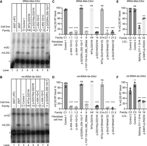 Human cell lines with bi-allelic TRMT1 variants exhibit a reduction in m2,2G modifications in tRNAs (A and B) Representative gels of primer extension assays to monitor the presence of m2,2G in tRNA-Met-CAU and mt-tRNA-Ile-GAU from the indicated cell lines. m3C20, 3-methylcytosine; m2,2G26, dimethylguanosine; m1G9, 1-methylguanosine. “>” points to labeled oligonucleotide used for primer extension; asterisk denotes background signal. (C–F) Quantification of m2,2G formation by primer extension for the indicated tRNAs. % m2,2G RT block represents the m2,2G stop signal divided by the sum of the m2,2G and read-through m3C or m1G stop signal. The number of replicates is shown in each bar graph with a minimum of two replicates per cell line. Error bars represent standard deviation from the mean. Statistical analysis was performed using one-way ANOVA. For (C) and (D), the mean of each column was compared to the control 1 cell line. For (E) and (F), the mean of each column was compared to the control 2 cell line. ∗p ≤ 0.05, ∗∗p ≤ 0.01, ∗∗∗p ≤ 0.001, ∗∗∗∗p < 0.0001; ns, non-significant (p > 0.05). |