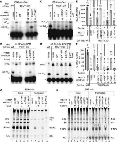 TRMT1 protein variants exhibit defects in reconstitution of tRNA-modification activity and interaction with tRNAs (A–D) Representative primer extension gels to monitor the presence of m2,2G in tRNA-Met-CAU and mt-tRNA-Ile-GAU from 293T cell lines transfected with the indicated constructs. m3C20, 3-methylcytosine; m2,2G26, dimethylguanosine; m1G9, 1-methylguanosine. “>” points to oligonucleotide used for primer extension; asterisk denotes background signal. (E and F) Quantification of m2,2G formation by primer extension for the indicated tRNAs. Primer extensions were performed at least three times per variant, and error bars represent the standard error of the mean. Statistical analysis was performed using one-way ANOVA. ∗p ≤ 0.05, ∗∗p ≤ 0.01, ∗∗∗p ≤ 0.001, ∗∗∗∗p < 0.0001; ns, non-significant (p > 0.05). (G and H) Nucleic acid stain of RNAs extracted from the indicated input or purified TRMT1-FLAG samples after denaturing PAGE. The migration pattern of tRNAs, 5.8S, and 5S ribosomal RNA is denoted. The p.L465_R466Δ insW variant is denoted as L465Δ in (E)–(H). |
