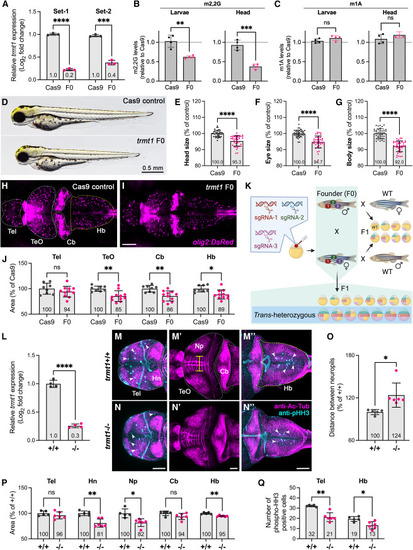 Depletion of Trmt1 in zebrafish causes developmental delay and reduced brain size due to decreased cell proliferation (A) RT-qPCR analysis of trmt1 expression in Cas9-injected control and trmt1 F0 knockout animals at 4 dpf. Expression levels were normalized to 18S and compared to the Cas9 controls. (B and C) LC-MS analysis of m2,2G or m1A in whole larvae or head-only samples. (D) Representative image for Cas9-injected control (Cas9) and trmt1 F0 knockout (F0) larvae at 3 dpf. (E–G) Quantifications of head, eye, and body sizes for Cas9 and trmt1 F0 animals (n = 40 embryos per group). Values are presented as a percentage of the mean value of Cas9 controls. Each dot represents one larva. (H and I) Representative live confocal images of Cas9 and trmt1 F0 larvae in Tg(olig2:dsRed);nacre reporter line at 5 dpf. Images are dorsal view with anterior to the left. dsRed is shown in magenta. Scale bar, 0.1 mm. (J) Quantification of brain regions as depicted in (H) for Cas9 (n = 8 larvae) and F0 (n = 11 larvae) larvae. (K) Schematic illustrating the experimental design: three sgRNAs targeting trmt1 exons were injected into one-cell-stage embryos to generate F0 knockouts. Sexually mature F0 knockouts were bred with WT fish, and the resulting F1 progeny were genotyped to identify inheritable mutant allele carriers. Positive F0 founder carriers were inbred to obtain trans-heterozygous (−/−) F1 knockout progeny. (L) RT-qPCR analysis of trmt1 expression in WT (+/+) control and trmt1 F1 knockout (−/−) larvae at 5 dpf. Experiments were performed with four biological replicates in technical triplicates. Expression levels were normalized to 18S and compared to the WT controls. (M and N) Confocal images of dissected trmt1+/+ (M to M″, n = 5 brains) and trmt1−/− (N to N″, n = 6 brains) larval brain at 5 dpf, stained with anti-acetylated tubulin (Ac-Tub, magenta) and anti-phospho-histone H3 (pHH3, cyan). (M) and (N) show the telencephalon, (M′) and (N′) show the optic tectum and cerebellum, and (M″) and (N″) show the hindbrain. Images are dorsal view with anterior to the left. Brain regions are outlined with a dotted line, and pHH3-positive cells are indicated by white arrowheads. Scale bars, 50 mm. (O) Quantification of the distance between two neuropils as indicated in (M′). (P) Quantifications of areas defined by dotted lines in (M), (M′), and (M″). (Q) Quantification of the number of phospho-histone H3-positive cells in telencephalon and hindbrain. Error bars indicate mean ± SD. For (L), (O), and (P), values are presented as a percentage of the mean value of trmt1+/+ controls. Mean values are displayed at the bottom of each bar. Statistical significance was calculated by unpaired t test with Welch’s correction: ns, non-significant (p > 0.05); ∗p < 0.05, ∗∗p < 0.01, ∗∗∗p < 0.001, ∗∗∗∗p < 0.0001. Tel, telencephalon; Hb, habenula; TeO, optic tectum; Np, tectal neuropil; Cb, cerebellum; Hb, hindbrain. |