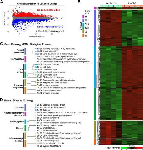 Transcriptomic analysis of Trmt1-depleted zebrafish larvae reveals differential gene expression related to multiple biological processes and human diseases (A) MA plot highlighting significant DEGs with base-2 log fold-change thresholds of ±1 and a false discovery rate (FDR) of <0.05. Red dots represent upregulated DEGs, while blue dots indicate downregulated DEGs. (B) Heatmap of the 2,000 DEGs, clustered using k-means based on their SD across all samples. Genes were grouped into six clusters, with the number of genes in each cluster shown at top left. (C) Hierarchical tree of the top three enriched GO biological process terms for each cluster, with FDR values displayed before the corresponding GO terms. (D) Hierarchical tree of the top three enriched Alliance Human Disease Ontology (DO) terms for each cluster, with FDR values placed before the DO terms. See Table S9 for detailed lists. |