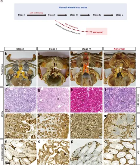 Phenotypic features of normal mud crabs at stage I, stage II, and stage IV as well as “abnormal” crabs. a Diagram illustrating the developmental processes of ovaries in normal female mud crabs and “abnormal” crabs. Normal female mud crabs undergo a terminal molt prior to mating, after which they engage in mating with males. This process includes the transition of oocytes from the oogonia stage to the previtellogenesis stage. However, a small proportion of female crabs exhibit a disruption in oogenesis post-mating, resulting in an inability of oocytes to absorb vitellogenin. b–e Images of the anatomical structures showing the overall morphology of mud crabs at different ovarian developmental stages. Ovaries are outlined with dotted lines and indicated by arrowheads. f–i The details of ovarian differentiation, including oocyte development, were revealed by Hematoxylin and eosin (H&E) staining. I, stage I oocyte (diameter 35-50 μm); II, stage II oocyte (diameter 45–100 μm); IV, stage IV oocyte (diameter 120-200 μm); me, meiotic cells. Representative results of three independent experiments were shown. j–m The ovary sections showed vitellogenin absorption in the oocytes, as detected by immunohistochemical staining (Vtg). Asterisk, vitellogenin. Representative results of three independent experiments were shown. n–q The sections of the hepatopancreas showing the vitellogenin production, as revealed by immunohistochemical staining (Vtg). Ht, hepatopancreatic tubules; asterisk, vitellogenin. Representative results of three independent experiments were shown. |