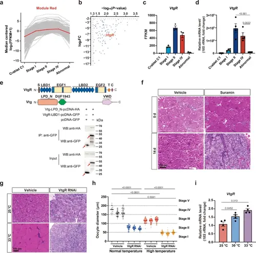 Deficiency in VtgR production leads to the formation of “abnormal” crabs.a Expression levels of genes from Module Red in the ovaries of normal mud crabs at different developmental stages and “abnormal” crabs. b The 101 genes from Module Red exhibit significantly downregulated expression in the ovaries of “abnormal” crabs compared to normal mud crabs at stage IV. Statistical significance was determined by the Ballgown parametric F-test. c RNA-seq based quantification of VtgR expression in the ovaries of normal mud crabs at different developmental stages and “abnormal” crabs (n = 3 crabs). d qPCR-based quantification of VtgR expression in the ovaries of normal mud crabs at different developmental stages and “abnormal” crabs. Relative gene expression was expressed as fold change compared to crabs at crablet stage C1 (n = 4 crabs). Statistical significance was determined by one-way ANOVA with Tukey’s test. e Co-IP assay confirming the interaction between the VtgR-LBD1 domain and the Vtg-LPD_N domain in mud crabs. The red arrowhead indicates the target band. Representative results from three independent experiments are shown. f Inhibition of VtgR-mediated endocytosis of Vtg in mud crabs using suramin. Representative results from three independent experiments are shown. g Histological analysis of ovaries from VtgR knockdown and control mud crabs maintained at normal (25 °C) and high (33 °C) temperatures. Representative results from three independent experiments are shown. h Oocyte diameter of different groups of mud crabs reared at 25 °C and 33 °C (n = 3 crabs). Horizontal black lines indicate the means. Statistical significance was determined by one-way ANOVA with Tukey’s test. i qPCR-based quantification of VtgR expression in the ovaries of normal mud crabs maintained at 25 °C, 30 °C, and 33 °C. Relative gene expression level was expressed as fold change compared to crabs maintained at 25 °C (n = 4 crabs). Statistical significance was determined by one-way ANOVA with Tukey’s test. Data are presented as the mean ± SEM. P values are indicated above the plots, with P < 0.05 considered statistically significant. Source data are provided as a Source Data file. |