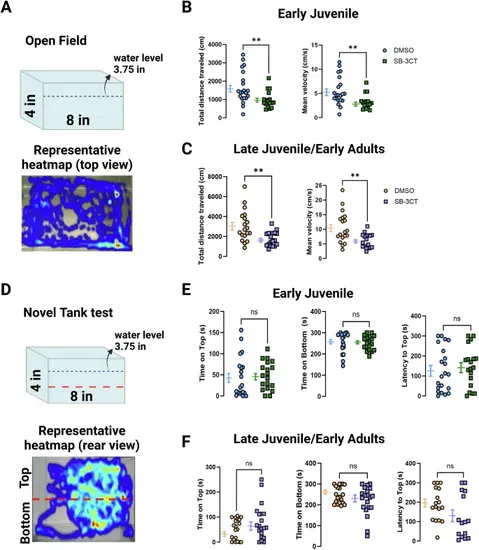 | MMP-2/9 inhibition decreases locomotion independently from anxiety/stress in zebrafish.A Top panel: representative cartoon of the Open field tank with dimensions and water level. Bottom panel: representative heatmap of the explorative trajectory of a juvenile DMSO-treated zebrafish. B Quantification of total distance traveled and mean velocity for early juvenile zebrafish. C Quantification of total distance traveled and mean velocity for late juvenile/early adult zebrafish. D Top panel: representative cartoon of the Novel Tank with dimensions, water level, and division of top versus bottom compartments (red dashed line). Note that the same setup was used to measure both behaviors. Bottom panel: representative heatmap of the trajectory of a juvenile non-treated zebrafish showing their time in each compartment. E Quantification of the time spent on either top or bottom compartment in the Novel Tank test as well as latency to reach the top of the tank for early juvenile zebrafish. F Quantification of the same parameters for late juvenile/early adult zebrafish. Unpaired Student’s t and Mann-Whitney tests. Graphs are expressed as mean ± S.E.M. Data were acquired with EthoVision XT16 software. **p < 0.01. Created in BioRender. https://BioRender.com/bvwowsr. |