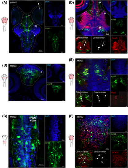 kcnb1 is expressed in distinct cell subtypes and various regions of the central nervous system in 6 days post fertilization (dpf) wild-type (WT) zebrafish. (A, B) Horizontal and transversal sections of WT zebrafish expressing cells (4,6-diamidino-2-phenylindole [DAPI]; blue) labeled with anti-kcnb1 (green), showing a large expression of the protein in the central nervous system (CNS) at 6 dpf. The protein is expressed in the telencephalon, diencephalon, midbrain including the optic tectum, and hindbrain comprising the cerebellum and the spinal cord (A: scale bar = 50 μm, magnification = 10×; B: scale bar = 30 μm, magnification 20×). (C) Horizontal section of a WT zebrafish at 6 dpf showing the presence of kcnb1 along the spinal cord (scale bar = 10 μm, magnification = 63×). (D–F) Horizontal sections of 6-dpf WT zebrafish expressing cells (DAPI; blue), kcnb1 (green), and specific cell subtype markers, respectively. (D) A neuronal nuclear marker (neuronal nuclear antigen [NeuN]; red, scale bar = 30 μm, magnification = 20×), (E) oligodendrocyte transcription factor 2 (Olig2; red, scale bar = 10 μm, magnification = 63×), and (F) CX3C motif chemokine receptor 1 expressed in microglial cells (CX3CR1; red, scale bar = 10 μm, magnification = 63×). Images demonstrate the colocalization between kcnb1 and the three different cell subtype markers, represented in white and marked by arrows. These results indicate the presence of kcnb1 in neurons, oligodendrocytes, and microglial cells. The colocalization was determined using Z-stack projection with IMARIS v10.1.0 software (Oxford Instruments). In figures, CNS regions are delimited by dotted lines. D, diencephalon; E, eyes; H, hindbrain; M: midbrain; T, telencephalon. n = 3–4/section. EXPRESSION / LABELING: