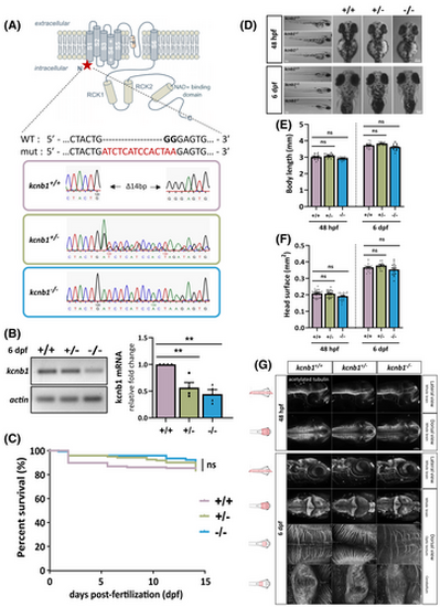 Genotypic characterization of a kcnb1 knockout (KO) zebrafish model without brain anatomical defects. (A) Schematic illustration of the generation of a kcnb1 KO zebrafish model obtained by Shen et al.40 The representation of the α-subunit kcnb1 is adapted from a previous schematic picture.44 Using the CRISPR-Cas9 (Clustered Regularly Interspaced Short Palindromic Repeats) system, the kcnb1 KO zebrafish model was generated by the insertion of a 14-bp nucleotide sequence (indicated in red) and of a 2-bp nucleotide deletion (indicated in black bold type) in the first exon of the gene, resulting in the introduction of a premature stop codon (∆14 bp), and localized between the N-terminal region and the first transmembrane domain of the protein (targeted sequence: GGAGCTGGACTACTGGGGAG in kcnb1 exon 1; ID zfin: ZDB-ALT-170417-2; indel mutation; line: kcnb1sq301/sq301). (B) Reverse transcription quantitative polymerase chain reaction analysis of total kcnb1 at 6 days post fertilization (dpf) demonstrating a significant decrease of kcnb1 mRNA in kcnb1+/− and kcnb1−/− compared with wild-type (WT; kcnb1+/+) larvae (N = 4; n = 30/sample; one-way analysis of variance [ANOVA] with Bonferroni post hoc test; **p < .01). Data are normalized to actin mRNA expression, and the condition kcnb1+/+ is considered as the reference value (relative fold change = 1). (C) Kaplan–Meier survival curve between 0 and 15 dpf showing that the loss of kcnb1 does not impact the normal growth of fish at early stages of development (see Table S1; N = 3; n = 121–169/genotype; log-rank test). (D) Images showing that kcnb1+/− and kcnb1−/− zebrafish do not show gross morphological changes at 48 hours post-fertilization (hpf) and 6 dpf (scale bar = 300 μm). (E, F) Quantification of major morphological aspects at 48 hpf and 6 dpf including measurement of (E) body length and (F) head surface. kcnb1 KO models (kcnb1+/− and kcnb1−/−) do not show any significant change in each parameter at different developmental stages as compared to kcnb1+/+ (N = 4; n = 28–38/genotype; one-way ANOVA with Bonferroni post hoc test). (G) Whole-mount images of embryonic (48 hpf) and larvae (6 dpf) zebrafish immunostained with anti-acetylated tubulin marker to identify global circuits of neuronal fibers (lateral and dorsal view; three-dimensional reconstruction; magnification = 20× with scale bar at 100 μm; magnification = 40× with scale bar at 20 μm). The loss of kcnb1 does not affect the neuronal brain density at different early stages of development (n = 5–7/genotype/developmental stage). ns, non-significant. |