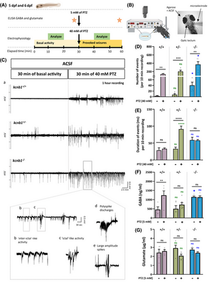 kcnb1−/− larvae show spontaneous and provoked epileptiform-like electrographic activity associated with a dysregulation of γ-aminobutyric acid (GABA). (A, B) Schematic representation of the protocol applied for electroencephalographic recordings and neurotransmitter quantification of 5 and 6 days post-fertilization (dpf) zebrafish. Neuronal activity in the optic tectum of zebrafish was recorded by applying a protocol of 30 min of basal activity followed by 30 min of 40mmol·L−1 pentylenetetrazol (PTZ) treatment. A 10-min segment in the middle of each period (basal activity and provoked seizures) was used to analyze the total number of negative spikes and duration of events for each genotype. Enzyme-linked immunosorbent assay (ELISA) was performed to quantify GABA and glutamate following a 30-min pre- and post-PTZ treatment at 5 mmol·L−1. (C; a) Representative traces of electroencephalographic recordings in the optic tectum of kcnb1+/+ and kcnb1 knockout (kcnb1+/− and kcnb1−/−) larvae showing spontaneous and provoked epileptiform-like electrographic activity in the kcnb1−/− model characterized by (b) interictal-like activity, (c) ictal-like activity, (d) polyspike discharges, and (e) large-amplitude spikes. (D, E) Quantification of electrophysiological recordings by analyzing (D) the total number of negative spikes and (E) the duration of events, over 10 min as described in panel A. kcnb1−/− larvae showed significantly increased spontaneous and provoked neuronal activity, reflected by a significant elevation of the number of spikes, although the duration of events was similar to the kcnb1+/+ condition in pre- and post-PTZ treatment. kcnb1+/− larvae presented a profile similar to the kcnb1+/+ condition in terms of number of spikes but showed a significant increase of event duration (see Table S3; n = 3–5/genotype; unpaired t-test). (F, G) Quantification of (F) GABA and (G) glutamate by ELISAs in the head of 6-dpf larvae following the 30-min pre- and post-5mmol·L−1 PTZ treatment. kcnb1−/− zebrafish present significantly increased GABA levels observed in both baseline and post-PTZ conditions conversely to kcnb1+/− larvae and compared to the kcnb1+/+ condition. We observed a lack of significant changes in glutamate levels in both kcnb1 knockout models (kcnb1+/− and kcnb1−/−) in pre- and post-PTZ conditions (N = 3–5; n = 50/sample; unpaired t-test). For panels D–G, colored statistic indications correspond to mutant conditions compared to the kcnb1+/+ condition in pre- or post-PTZ treatment. *p < .05, **p < .01, ***p < .001, ****p < .0001. ACSF, artificial cerebrospinal fluid; ns, non-significant. PHENOTYPE: