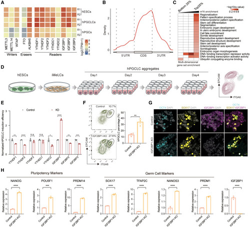 The m6A reader IGF2BP1 suppresses hPGCLCs induced from hESCs (A) Expression levels of m6A writers, erasers, and readers in hESCs, hPGCLCs, and hPGCs. (B) Enrichment of m6A modifications across mRNA transcriptome in hESCs. CDS: coding sequence. UTR: untranslated regions. (C) Heatmap showing gene set enrichment analysis for m6A-modified genes in hESCs. (D) Illustration of hESC to hPGCLC differentiation strategy. (E) Normalized hPGCLC induction efficiency for CRISPRi screening the m6A readers (mean ± SEM, n = 3, biological replicates; n.s., not significant, ∗p < 0.05, ∗∗p < 0.01, ∗∗∗p < 0.001, ∗∗∗∗p < 0.0001, unpaired t test). (F) Flow cytometry showing the percentage of day-4 hPGCLCs induced from control and IGF2BP1-KO hESCs (mean ± SEM, n = 3, biological replicates; ∗∗p < 0.01, unpaired t test). (G) Immunofluorescence for OCT4 (cyan), SOX17 (yellow), and IGF2BP1 (magenta) for day-4 hPGCLC aggregates induced from control and IGF2BP1-KO hESCs. DAPI (gray) is counterstained for nuclei. Scale bar: 10 μm. (H) qPCR showing the expression of pluripotency and germ cell markers in control and IGF2BP1-KO day-4 hPGCLC aggregates (mean ± SEM, n = 3, technical replicates; ∗∗∗p < 0.001, ∗∗∗∗p < 0.0001, unpaired t test). See also Figure S1 and Tables S1 and S7. |