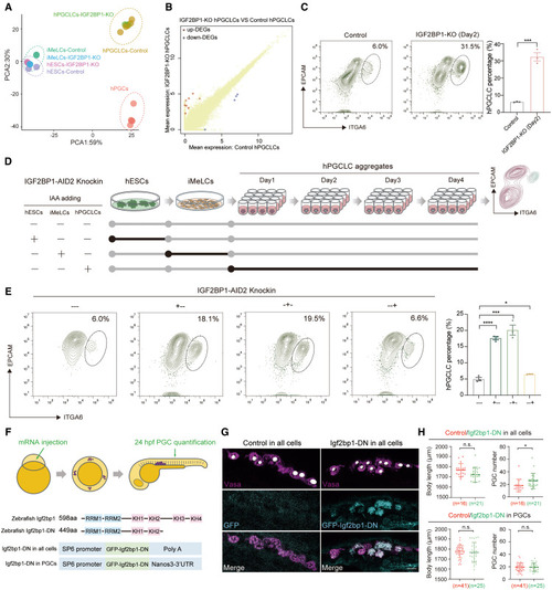 IGF2BP1 is involved in the regulation of hESC to hPGCLC induction (A) PCA plot showing the transcriptomes of control and IGF2BP1-KO hESCs, iMeLCs, day-4 hPGCLCs, and embryonic hPGCs. (B) DEGs of IGF2BP1-KO day-4 hPGCLCs compared with control day-4 hPGCLCs. p value < 0.05. (C) Flow cytometry showing the percentage of day-2 hPGCLCs induced from control and IGF2BP1-KO hESCs (mean ± SEM, n = 3, biological replicates; ∗∗∗p < 0.001, unpaired t test). (D) Schematic illustration showing the design for adding IAA to IGF2BP1-AID2-knockin cells at different stages of hPGCLC induction. (E) Flow cytometry showing the percentage of day-4 hPGCLCs induced from hESCs with IAA added at different stages during hPGCLC induction (mean ± SEM, n = 3, biological replicates; ∗p < 0.05, ∗∗∗p < 0.001, ∗∗∗∗p < 0.0001, unpaired t test). (F) Schematic illustration of experimental design for overexpressing wild-type or dominant negative (DN) forms of Igf2bp1 in all cells or in PGCs only. (G) Immunofluorescence for Vasa (magenta) and GFP (gray) for quantification of PGCs. Scale bar: 10 μm. (H) Quantification of body length and PGC numbers with overexpression of Igf2bp1 (control) and Igf2bp1-DN in all cells and in PGCs. n, Number of PGCs (mean ± SEM, biological replicates; n.s., not significant, ∗p < 0.05, unpaired t test). See also Figure S2 and Table S2. |