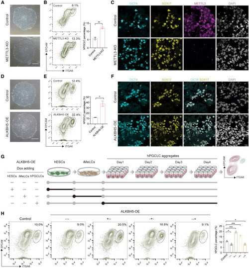m6A modifications are involved in hPGCLC induction from hESCs (A) Phase contrast images showing the morphology of control and METTL3-KO hESCs. Scale bar: 200 μm. (B) Flow cytometry showing the percentage of day-4 hPGCLCs induced from control and METTL3-KO hESCs (mean ± SEM, n = 3, biological replicates; ∗∗p < 0.01, unpaired t test). (C) Immunofluorescence for OCT4 (cyan), SOX17 (yellow), and METTL3 (magenta) for day-4 hPGCLC aggregates induced from control and METTL3-KO hESCs. DAPI (gray) is counterstained for nuclei. Scale bar: 10 μm. (D) Phase contrast images showing the morphology of control and ALKBH5-OE hESCs. Scale bar: 200 μm. (E) Flow cytometry showing the percentage of day-4 hPGCLCs induced from control and ALKBH5-OE hESCs (mean ± SEM, n = 2, biological replicates; ∗p < 0.05, unpaired t test). (F) Immunofluorescence for OCT4 (cyan) and SOX17 (yellow) for day-4 hPGCLC aggregates induced from control and ALKBH5-OE hESCs. DAPI (gray) is counterstained for nuclei. Scale bar: 10 μm. (G) Schematic illustration showing the design for overexpressing ALKBH5 at different stages of hPGCLC induction. (H) Flow cytometry showing the percentage of day-4 hPGCLCs induced from hESCs with ALKBH5-OE at different stages during hPGCLC induction (mean ± SEM, n = 3, biological replicates; ∗p < 0.05, ∗∗∗p < 0.001, unpaired t test). See also Figure S3. |