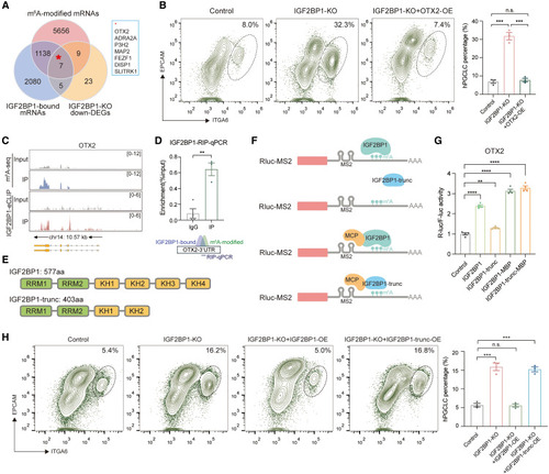 OTX2 mRNA is regulated by m6A modifications to restrict germ cell fate (A) Venn diagram showing the overlap of m6A-modified mRNAs, IGF2BP1-bound mRNAs, and downregulated DEGs (|log2FoldChange| > 2) in IGF2BP1-KO hESCs. (B) Flow cytometry showing the percentage of day-4 hPGCLCs induced from control, IGF2BP1-KO, and IGF2BP1-KO+OTX2-OE hESCs (mean ± SEM, n = 3, biological replicates; n.s., not significant, ∗∗∗p < 0.001, unpaired t test). (C) Tracks showing the m6A-seq peaks and IGF2BP1-eCLIP peaks on OTX2 genomic region. (D) RIP with antibodies against FLAG using IGF2BP1-3xFLAG knockin hESCs. qPCR was performed to determine the binding of IGF2BP1 to the 3′UTR of OTX2. Immunoglobulin G (IgG) served as a control. Enrichment of the indicated genes was normalized to the input level (mean ± SEM, n = 3, technical replicates; ∗∗p < 0.01, unpaired t test). (E) Schematic illustration of full-length and truncation (trunc) forms of IGF2BP1 protein. (F) Schematic illustration of tethering experiments for IGF2BP1 and IGF2BP1-trunc to the 3′UTR of OTX2. (G) Luciferase assay for detecting the activity of IGF2BP1, IGF2BP1-trunc, IGF2BP1-MCP, and IGF2BP1-trunc-MCP on OTX2-3UTR (mean ± SEM, n = 4, technical replicates; ∗∗p < 0.01, ∗∗∗∗p < 0.0001, unpaired t test). (H) Flow cytometry showing the percentage of day-4 hPGCLCs induced from control, IGF2BP1-KO, IGF2BP1-KO+IGF2BP1-OE, and IGF2BP1-KO+IGF2BP1-trunc-OE hESCs (mean ± SEM, n = 3, biological replicates; n.s., not significant, ∗∗∗p < 0.001, unpaired t test). See also Figure S4 and Table S3 |