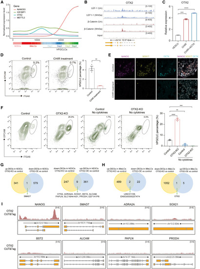 The regulation of OTX2 expression during hPGCLC induction (A) Pseudotime curves showing the expression patterns of NANOS3, IGF2BP1, OTX2, and METTL3 in single cells from germline trajectory based on the single-cell RNA sequencing (scRNA-seq) of hESCs, iMeLCs, and day 1–4 hPGCLC aggregates. (B) Tracks showing the binding of LEF1 and β-catenin around the genomic region of OTX2 from ChIP-seq of LEF1 and β-catenin in hESCs. Un: untreated. (C) qPCR showing the expression of OTX2 in hESCs, hESCs treated with CHIR99021 (CHIR), and hESCs treated with CHIR and ACTIVIN A (ACTA) (mean ± SEM, n = 2, technical replicates; ∗∗∗p < 0.001, ∗∗∗∗p < 0.0001, unpaired t test). (D) Flow cytometry showing the percentage of day-4 hPGCLCs induced from control and CHIR-treated cells (mean ± SEM, n = 3, biological replicates; ∗∗p < 0.01, unpaired t test). (E) Immunofluorescence of NANOG (magenta), SOX17 (yellow), and OCT4 (cyan) for day-4 hPGCLC aggregates induced from control and CHIR-treated hESCs. DAPI (gray) is counterstained for nuclei. Scale bar: 10 μm. (F) Flow cytometry showing the percentage of day-4 hPGCLCs induced from control with cytokines, OTX2-KO with cytokines, control without cytokines, and OTX2-KO without cytokines (mean ± SEM, n = 3, biological replicates; ∗∗p < 0.01, ∗∗∗p < 0.001, ∗∗∗∗p < 0.0001, unpaired t test). (G) Overlap of upregulated DEGs in OTX2-KO hESCs with downregulated DEGs in OTX2-OE hESCs; and overlap of downregulated DEGs in OTX2-KO hESCs with upregulated DEGs in OTX2-OE hESCs. (H) Overlap of upregulated DEGs in OTX2-KO iMeLCs with downregulated DEGs in OTX2-OE iMeLCs and overlap of downregulated DEGs in OTX2-KO iMeLCs with upregulated DEGs in OTX2-OE iMeLCs. (I) Tracks showing the binding of OTX2 for overlapped genes from Figures 5G and 5H based on the CUT&Tag of OTX2 in iMeLCs. See also Figure S5 and Table S4. |