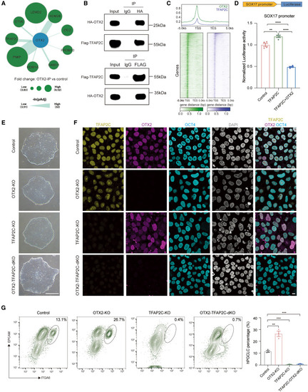 OTX2 antagonizes TFAP2C for restricting human germ cell fate (A) Bubble plot showing the interacting proteins for OTX2 based on IP-MS of OTX2 in hESCs. (B) Reciprocal coimmunoprecipitation (coIP) experiments showing the physical interaction between OTX2 and TFAP2C. (C) Metaplots showing the binding of OTX2 and TFAP2C in genomic regions. (D) Luciferase assay detecting the effects of TFAP2C and OTX2 on the promoter of SOX17 (mean ± SEM, n = 4, technical replicates; ∗∗p < 0.01, ∗∗∗∗p < 0.0001, unpaired t test). (E) Phase contrast images showing the morphology of control, OTX2-KO, TFAP2C-KO, and OTX2-TFAP2C-dKO hESCs. Scale bar: 200 μm. (F) Immunofluorescence for TFAP2C (yellow), OTX2 (magenta), OCT4 (cyan), and DAPI (gray) in control, OTX2-KO, TFAP2C-KO, and OTX2-TFAP2C-dKO hESCs. Scale bar: 10 μm. (G) Flow cytometry showing the percentage of day-4 hPGCLCs induced from control, OTX2-KO, TFAP2C-KO, and OTX2-TFAP2C-dKO hESCs (mean ± SEM, n = 3, biological replicates; ∗∗p < 0.01, ∗∗∗p < 0.001, unpaired t test). See also Figure S6 and Tables S5 and S7. |