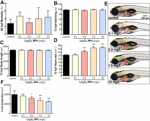 Developmental toxicity of La2O3 NPs to zebrafish embryos and larvae. (A) Mortality of zebrafish larvae exposed to La2O3 NPs at 96 hpf. (B) Hatchability of zebrafish larvae exposed to La2O3 NPs at 72 hpf. (C) The body length of zebrafish larvae exposed to La2O3 NPs at 72 hpf. (D) Heart rate of zebrafish larvae exposed to La2O3 NPs at 72 hpf. (E) Liver morphology and size of zebrafish larvae exposed to La2O3 NPs at 120 hpf. (F) Liver area statistics of zebrafish larvae exposed to La2O3 NPs at 120 hpf. Values are expressed as mean ± SEM. Statistical analysis was done by One-way ANOVA and Bonferroni test, compared to the control group, *p < 0.05, * * p < 0.01, * ** p < 0.001. |