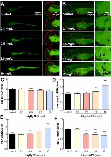 La2O3 NPs induced oxidative stress and apoptosis in zebrafish larvae. (A) Reactive oxygen species (ROS) content in zebrafish larvae after treatment by La2O3 NPs at 120 hpf. (B) AO staining of zebrafish larvae exposed to 72 hpf. The mRNA expression of (C) bax, (D) caspase3, (E) tnf-a, (F) bcl-2 after zebrafish larvae were exposed to La2O3 NPs. Values are expressed as mean ± SEM. Statistical analysis was done by One-way ANOVA and Bonferroni test, compared to the control group, *p < 0.05, * *p < 0.01, * **p < 0.001. |