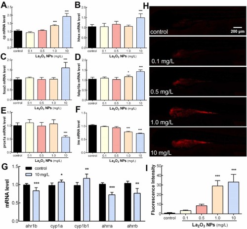 La2O3 NPs induced the change of liver development gene expression and the activation of the ahr signaling pathway in zebrafish. The mRNA expression of (A) cp, (B) hhex, (C) foxa3, (D) fabp10a, (E) prox1a, (F) ins after zebrafish larvae were exposed to La2O3 NPs. (G) ahr signaling pathway in zebrafish larvae exposed to La2O3 NPs. (H-I) Fluorescence intensity of cyp1a-mcherry zebrafish larvae exposed to La2O3 NPs to 120 hpf. Values are expressed as mean ± SEM. Statistical analysis was done by One-way ANOVA and Bonferroni test, compared to the control group, *p < 0.05, * *p < 0.01, * **p < 0.001. |