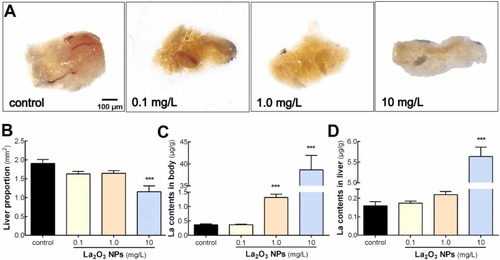 Liver morphology and La content of zebrafish after exposure to La2O3 NPs. (A) Liver morphology, (B) Liver area after 90 days of La2O3 NPs exposure. (C) Content of La in zebrafish after continuous exposure to La2O3 NPs for 90 days. (D) La content in the liver of zebrafish after 90 days of continuous exposure to La2O3 NPs. Values are expressed as mean ± SEM. Statistical analysis was done by One-way ANOVA and Bonferroni test, compared to the control group, *p < 0.05, * *p < 0.01, * **p < 0.001. |