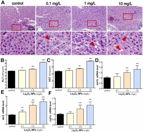 Exposure to La2O3 NPs induced liver injury in zebrafish. (A) Histological lesions in the liver exposed to La2O3 NPs. Macro vacuoles were indicated by red arrows. (B) ALT, (C) AST activity in the liver of zebrafish in the control group and La2O3 NPs exposure group. (D-F) The mRNA expression of ahr1b, ahr2, and cyp1a genes in the liver. Values are expressed as mean ± SEM. Statistical analysis was done by One-way ANOVA and Bonferroni test, compared to the control group, *p < 0.05, * *p < 0.01, * **p < 0.001. |
