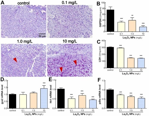 Effects of La2O3 NPs exposure on glucose metabolism. (A) PAS staining of the liver. Glycogen deposits were indicated by red arrows. (B) G6PDH, (C) LDH activity in the liver of zebrafish in the control group and La2O3 NPs exposure group. The mRNA expression of (D) gys2, (E) hk1, and (F) pdhx after zebrafish were exposed to La2O3 NPs. Values are expressed as mean ± SEM. Statistical analysis was done by One-way ANOVA and Bonferroni test, compared to the control group, *p < 0.05, * *p < 0.01, * **p < 0.001. |