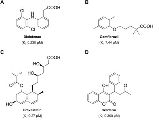 Drugs that were demonstrated to inhibit drOatp1d1 with comparably high potencies (Ki < 10 µM): diclofenac (A) [7,8], gemfibrozil (B) [8,14], pravastatin (C) [14], warfarin (D) [14]. |