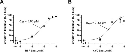 Concentration-effect curves of the model drOatp1d1 substrate bromosulfophthaleine (BSP; A) [14] and the newly established drOatp1d1 inhibitor cyclosporine A (CYC; B) [14] determined in a cell-based functional assay using radiolabeled [3H]BSP and stably transfected HEK-drOatp1d1 cells and respective HEK-Co cells [7]. Shown is mean ± standard error of the mean (SEM) of at least four independent experiments. |