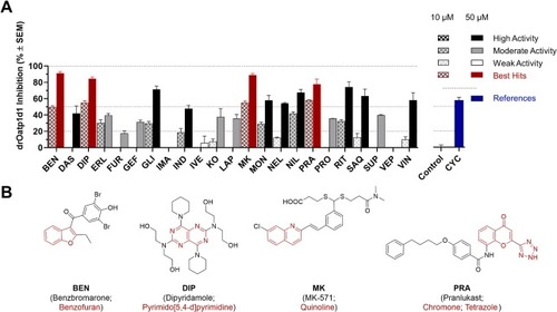 Initial screening of the high-quality compound collection of 23 pan-ABC transporter modulators against drOatp1d1 (A) applying a cell-based functional assay using radiolabeled [3H]BSP and stably transfected HEK-drOatp1d1 and HEK-Co cells [7]. Net uptake was calculated by subtracting the uptake into HEK-Co cells from the uptake into HEK-drOatp1d1 cells and data are given in relation to the net uptake without added substance (0 % inhibition). Inhibition of BSP uptake into HEK-Co cells and HEK-drOatp1d1 cells by the newly established drOatp1d1 transport inhibitor cyclosporine A (CYC; 5 µM; blue) is shown as reference [14]. The effect values of the 23 drugs and drug-like compounds at 10 µM (patterned bars) and 50 µM (filled bars) were categorized according to their high [effect value ≥ 50 % (+SEM); black], moderate [effect value ≥ 20 % (+SEM); gray], and weak [effect value < 20 % (+SEM); white] activity. Red annotation: Benzbromarone (BEN), dipyridamole (DIP), MK-571 (MK), and pranlukast (PRA) were identified as the most potent hit compounds even exceeding the inhibitory power of CYC on drOatp1d1-mediated transport, and their molecular formulae are provided with highlighted basic scaffolds (red; B). Shown are mean ± SEM values of at least four independent experiments. (For interpretation of the references to color in this figure legend, the reader is referred to the web version of this article.) |