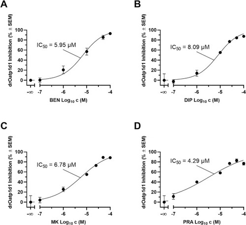 Concentration-effect curves of benzbromarone (BEN; IC50: 5.95 µM ± 1.49 µM; A), dipyridamole (DIP; IC50: 8.09 µM ± 0.28 µM; B), MK-571 (MK; IC50: 6.78 µM ± 0.39 µM; C), and pranlukast (PRA; IC50: 4.29 µM ± 0.60 µM; D) against drOatp1d1 applying a cell-based functional assay using radiolabeled [3H]BSP and stably transfected HEK-drOatp1d1 cells and the respective HEK-Co cells [7]. Shown is mean ± SEM of at least four independent experiments. |