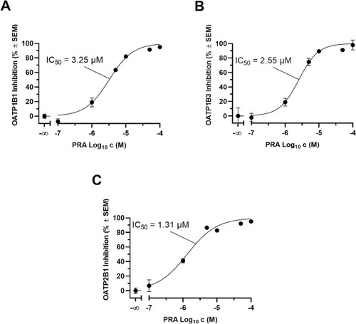 Concentration-dependent inhibition of OATP1B1, OATP1B3, and OATP2B1-mediated transport by PRA determined in a cell-based functional assay using radiolabeled [3H]BSP and stably transfected HEK-OATP1B1 (IC50: 3.25 µM ± 0.09 µM; A), HEK-OATP1B3 (IC50: 2.55 µM ± 0.21 µM; B), and HEK-OATP2B1 (IC50: 1.31 µM ± 0.06 µM; C) as well as respective HEK-Co cells. IC50 values were calculated based on net uptake values (uptake into HEK-Co cells subtracted from the uptake into HEK-transporter-expressing cells) and the net uptake without PRA was set to 0 % uptake inhibition. Shown is mean ± SEM of at least four independent experiments. |