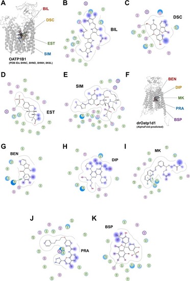 Structural analyses of human OATP1B1 (PDB IDs 8HNC, 8HND, 8HNH, and 8K6L) and colocalized ligands (A), i.e., bilirubin (BIL; B), 2′,7′-dichlorofluorescein (DCF; C), the pan-SLC transporter modulator estrone sulfate (EST; D), and simeprevir (SIM; E). Additionally shown is the AlphaFold 3-generated [43] structure of drOatp1d1 (UniProt entry A0A8M9PU70; F) with blindly-docked molecules, i.e., BEN (G), DIP (H), MK (I), PRA (J), and BSP (K). |
