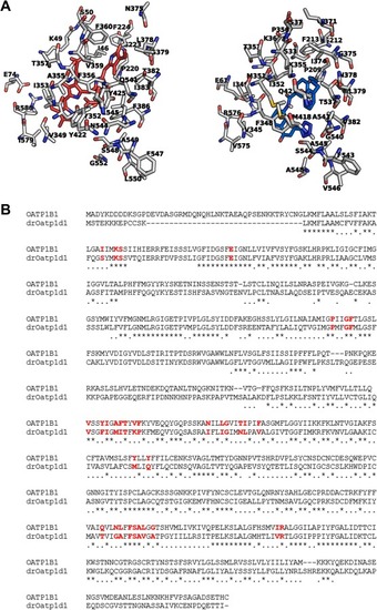 Structural comparison of the binding pockets of human OATP1B1 and drOatp1d1. A The protein backbones are shown in white (nitrogens: blue; oxygens: red; sulfurs: yellow), with key binding site residues labeled; left: BIL (red); right: PRA (blue). B Sequence alignment between human OATP1B1 (UniProt entry Q9Y6L6) and drOatp1d1 (UniProt entry A0A8M9PU70). The residues in the binding pocket highlighted in red, indicating conserved key residues involved in ligand interaction and transport function. (For interpretation of the references to color in this figure legend, the reader is referred to the web version of this article.) |