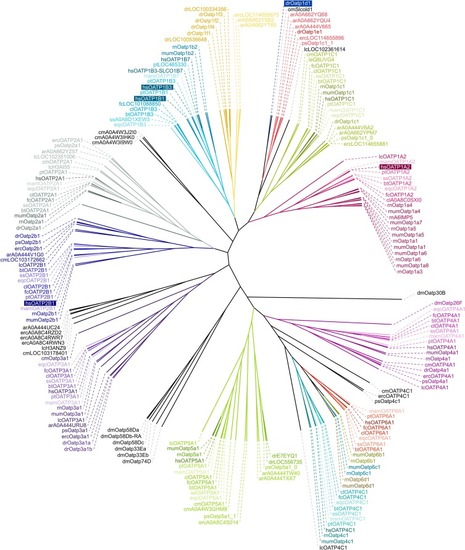Phylogenetic tree of OATPs of typical mammals, clinically relevant species, and members from four clades of bony and cartilaginous fish based on protein sequences retrieved from UniProt (https://www.uniprot.org). Abbreviations (alphabetically sorted): ar – Acipenser ruthenus (starlet); bt – Bos taurus (cattle); cl – Canis lupus (wolf); cm – Callorhinchus milii (Australian ghostshark); dm – Drosophila melanogaster (fruitfly); dr – Danio rerio (zebrafish); ec – Equus caballus (horse); fc – Felis catus (cat); hs − Homo sapiens (human); lc – Latimeria chalumnae (west Indian ocean coelacanth); mam – Macaca mulatta (rhesus macaque); mum – Mus musculus (house mouse); pt – Pan troglodytes (chimpanzee); rn – Rattus norvegicus (brown rat); ss – Sus scrofa (wild boar). |