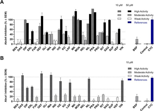 Functional analyses of the 23 pan-ABC transporter modulators against drAbcb4 [39] (A) and murine Abca1 [40,41] (B) determined in rhodamine B and 25-NBD-cholesterol assays, respectively, in zebrafish embryos and murine J774A.1 macrophages, respectively. The compounds were tested at 10 µM (patterned bars) and 50 µM (filled bars) and highly [effect value ≥ 50 % (+SEM); black], moderately [effect value ≥ 20 % (+SEM); gray], and weakly [effect value < 20 % (+SEM); white] active compounds were annotated. Negative (control; white) and positive [CYC, 40 µM (A) and 10 µM (B); blue] responses are shown. Shown are the mean ± SEM values of at least two independent experiments. (For interpretation of the references to color in this figure legend, the reader is referred to the web version of this article.) |