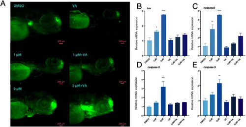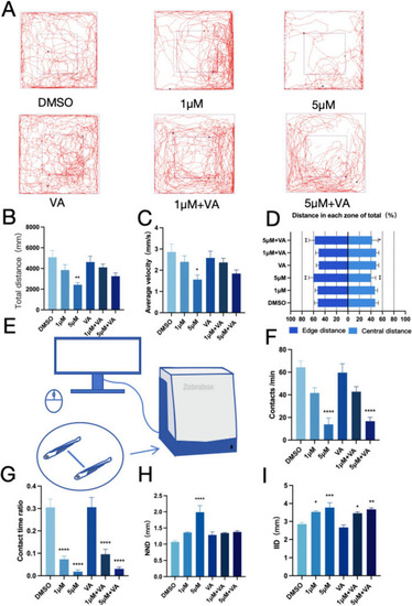 Vitamin A improves neurodevelopment and the relative expression of dopamine-related genes. DMSO was used as the control group in this experiment. The 1 μM group represented the exposure group with a PFOS concentration of 1 μM, and the 5 μM group represented the exposure group with a PFOS concentration of 5 μM. “VA” refers to the vitamin A group; 1 μM + VA denotes the vitamin A intervention group with a PFOS concentration of 1 μM, and 5 μM + VA denotes the vitamin A intervention group with a PFOS concentration of 5 μM. |