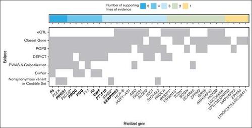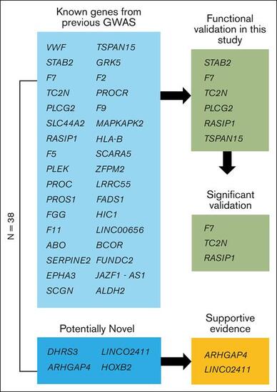 Schematic view of genes. Of the 38 genome-wide significant loci, 4 are potentially novel, and 34 are known from previous GWASs. Of the potentially novel genes, 2 have supportive evidence from recent GWAS meta-analyses.38,39 Six of the previously known genes were functionally validated in this study using a zebrafish model of blood clotting with 3 genes showing supportive evidence (significant validation) as the causal gene for modification of VTE in humans. |