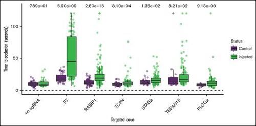 Functional evidence for causal genes in genetically modified zebrafish.P values from Wilcoxon rank sum tests are listed at the top. The y-axis represents the experimental TTO for control and sgRNA-injected zebrafish embryos with the x-axis showing the genes targeted through CRISPR. Injections made without sgRNA served as a negative control. Factor 7 (F7) served as a positive control. |