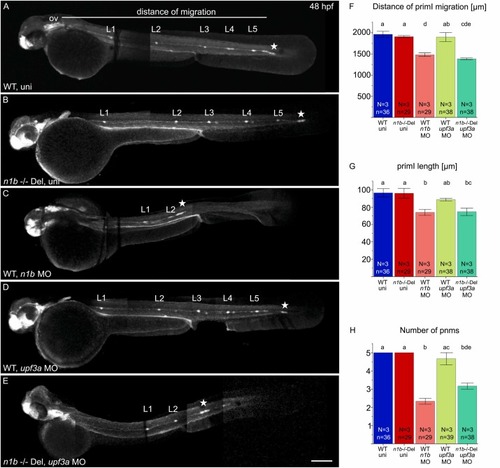 Knockdown of upf3a in ncam1b mutants partially phenocopies the ncam1b knockdown phenotype. (A–E) Lateral views of 48 hpf Tg(ClaudinB::lynGFP) (A) Wild type uninjected (WT uni) (B) n1b -/- Del uninjected, (C) n1b MO in WT, (D) upf3a MO in WT and (E) upf3a MO in n1b -/- Del. Embryos are oriented with rostral to the left and dorsal to the top. (A) At 48 hpf, primI (star) of WT reaches the tip of the tail and deposits 5 proneuromasts (L1–L5). The migration distance was measured from the otic vesicle (ov) to primI. (B) n1b -/- Del mutants show the same phenotype as WT, with primI reaching the tip of the tail and 5 deposited proneuromasts. (C) ncam1b MO injection leads to reduced migration of a smaller primI and deposition of fewer proneuromasts. (D) upf3a MO injection in WT does not induce any defects in lateral line system development. (E) upf3a MO injection in n1b -/- Del leads to reduced primI migration and fewer deposited neuromasts. (F–H) Quantification of migration distance, primI length and number of proneuromasts. Bars indicate mean values of relative numbers, with error bars representing standard error. Differences between the five groups were analyzed using a one-way ANOVA followed by Scheffé post hoc tests. Differences were considered significant if the F-value exceeded the critical Scheffé value (p < 0.05). Groups that share the same letter do not differ significantly. Groups with different letters show significant differences in their means. Scale bar 200 µm. Abbreviations: WT: Wild type; n1b -/- Del: ncam1b deletion mutant; MO: Morpholino; uni: uninjected; primI: primordium; pnm: proneuromast, ov: otic vesicle. |