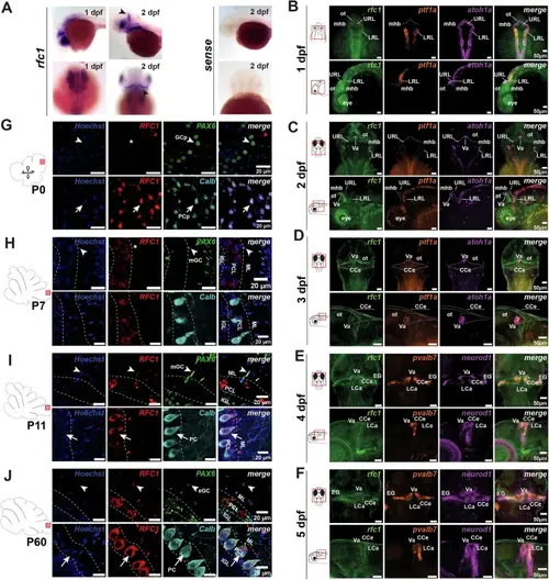 | RFC1 is expressed in the developing cerebellum.A Whole-mount in situ hybridization for rfc1 shows specific, though not exclusive, expression in the developing cerebellum of zebrafish embryos at 1 and 2 days post-fertilization (dpf) (arrowheads; n ≥ 10 per stage). B–F RNAscope in situ hybridization detecting rfc1, ptf1a, and atoh1a transcripts at 1 dpf (B), 2 dpf (C), and 3 dpf (D); and rfc1, pvalb7, and neurod1 at 4 dpf (E) and 5 dpf (F). ot optic tectum, mhb midbrain-hindbrain boundary, URL upper rhombic lip, LRL lower rhombic lip, Va valvula cerebelli, CCe corpus cerebelli, LCa lobus caudalis cerebelli; n = 5 per stage. G–J Co-immunofluorescence for RFC1 (red) and either PAX6 (granule cell marker, green) or calbindin (Calb, Purkinje cell marker, green) in the developing mouse cerebellum at postnatal day P0 (G), P7 (H), P11 (I), and P60 (J). RFC1 is detected in Purkinje cell progenitors (PCp, arrows in G) but absent from granule cell progenitors (GCp, asterisks and arrowheads in G). From P11 onwards, RFC1 is observed in some migratory granule cells (mGC, arrowheads in I) and in Purkinje cells (PC, arrows in H, I). At P60 (J), RFC1 remains detectable in Purkinje cells (PC, arrows) and in ectopic granule cells located in the molecular layer (eGC, arrowheads). For each stage, images are representative of N = 3 animals for P0, P7, and P60, and N = 4 animals for P11, with n = 6 fields of view per animal. ML molecular layer, PCL Purkinje cell layer, IGL internal granular layer. Scale bars: 50 μm (B–F), 20 μm (G–J). |