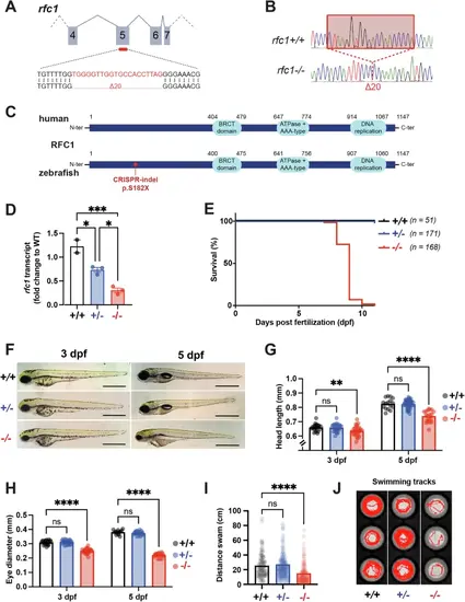 | Rfc1 loss-of-function leads to premature death, head morphological anomalies and motility defects in zebrafish.A–C Generation of an rfc1 mutant zebrafish line carrying a 20-bp deletion in exon 5, confirmed by Sanger sequencing (B). This deletion induces a frameshift resulting in a premature stop codon at position 182 (p.S182X), upstream of all three conserved RFC1 functional domains: BRCT, ATPase+ AAA-type, and DNA replication domains (C). D RT-qPCR quantification of rfc1 transcript levels showing a significant reduction in heterozygous (rfc1+/−, n = 3) and homozygous mutant (rfc1−/−, n = 3) larvae compared to wild-type (rfc1+/+, n = 2). E Survival curve of zebrafish larvae showing premature lethality of rfc1−/− individuals by 10 days post-fertilization (dpf). F Representative images of larvae at 3 and 5 dpf showing reduced head and eye size in rfc1−/− larvae, but not in heterozygous siblings. G, H Quantification of craniofacial parameters in rfc1 mutant larvae. G Head length at 3 dpf (n = 22 rfc1+/+, 26 rfc1+/–, 26 rfc1–/–) and 5 dpf (n = 16 rfc1+/+, 41 rfc1+/–, 19 rfc1–/–). H Eye diameter at 3 dpf (n = 22 rfc1+/+, 28 rfc1+/–, 26 rfc1–/–) and 5 dpf (n = 16 rfc1+/+, 22 rfc1+/–, 20 rfc1–/–). I Quantification of total distance swum over 1 h (lights off), demonstrating significant hypomotility in rfc1−/− larvae at 5 dpf compared to siblings (N = 3, n = 101 rfc1+/+, 160 rfc1+/−, 107 rfc1−/−). J Representative swimming tracks recorded over 10 min at 5 dpf, illustrating reduced locomotor activity in rfc1−/− larvae. Data in (D, G–I) are presented as mean ± SEM; individual dots represent biological replicates. Statistical analysis: one-way ANOVA with multiple comparisons. ns not significant (p > 0.05); * (p ≤ 0.05); ** (p ≤ 0.01); *** (p ≤ 0.001); **** (p ≤ 0.0001). |