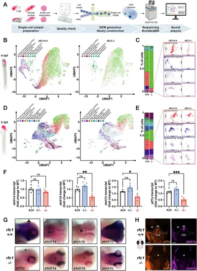 | RFC1 is expressed in early neural progenitors and is required for their proliferation.A Workflow for single-cell RNA sequencing (scRNA-seq). Microdissected heads (2 dpf) or brains (4 dpf) from rfc1+/+ and rfc1−/− larvae were pooled (three heads at 2 dpf or four brains at 4 dpf), dissociated, and processed for scRNA-seq using 10X Genomics technology. Created in BioRender. Samarut, E. (2025) https://BioRender.com/k7eukl7. B, D Uniform manifold approximation and projection (UMAP) plots of scRNA-seq data from 4 dpf (B) and 2 dpf (D) microdissected brains of rfc1+/+ and rfc1−/− larvae. Clusters of cells have been annotated following Seurat’s standard procedure, based on the accumulation of specific genes within top markers (see Supplementary Fig. S5B, C). C, E Proportions of cells in each identified cluster at 4 dpf (C) and 2 dpf (E), with UMAPs highlighting clusters significantly reduced in rfc1−/− brains. F RT-qPCR quantification of atoh1a, atoh1b, atoh1c, and ptf1a transcript levels in whole larvae at 3 dpf (rfc1+/+, rfc1+/–, and rfc1−/−, with n = 5 for each condition). G Whole-mount in situ hybridization for atoh1a, atoh1b, atoh1c, and ptf1a transcripts at 3 dpf in rfc1+/+ and rfc1−/− larvae. Expression in the cerebellum of wild-type larvae is indicated by arrowheads; loss of expression in mutants is marked by asterisks. H RNAscope in situ hybridization for ptf1a and atoh1a at 3 dpf in rfc1+/+ and rfc1−/− larvae. Scale bars: 50 μm. ot optic tectum, Va valvula cerebelli, CCe corpus cerebelli. Data in (F) are presented as mean ± SEM; individual dots represent biological replicates. Statistical analysis: one-way ANOVA with multiple comparisons. ns not significant (p > 0.05); * (p ≤ 0.05); ** (p ≤ 0.01); *** (p ≤ 0.001); **** (p ≤ 0.0001). |