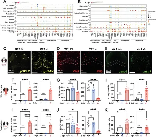 | RFC1 loss-of-function impairs neural progenitor proliferation and induces cell death.A, B Dot plots showing the expression of genes related to DNA damage sensing, cell cycle checkpoints, proliferation, DNA repair, and apoptosis across individual scRNA-seq clusters at 2 dpf (A) and 4 dpf (B) in rfc1+/+ and rfc1−/− brains (see Supplementary Fig. S4B, C for cluster annotations). Icons are created in BioRender. Samarut, E. (2025) https://BioRender.com/k7eukl7. C–E Immunostaining in the developing brain at 3 dpf using: C anti-γH2AX antibody (marker of DNA double-strand breaks), D anti-phospho-Histone H3 (PH3) antibody (mitotic marker), E anti-cleaved caspase-3 (casp3) antibody (apoptosis marker). Dotted lines delineate the developing cerebellum. F–H Quantification of γH2AX⁺, PH3⁺, and caspase-3⁺ cells in the whole brain of rfc1+/+, rfc1+/–, and rfc1–/– larvae at 2 and 3 dpf. F γH2AX-positive cells: 2 dpf (n = 10 rfc1+/+, 9 rfc1+/–, 11 rfc1–/–), 3 dpf (n = 10 rfc1+/+, 10 rfc1+/–, 10 rfc1–/–), N = 2. G PH3-positive cells: 2 dpf (n = 9 rfc1+/+, 11 rfc1+/–, 7 rfc1–/–), 3 dpf (n = 8 rfc1+/+, 8 rfc1+/–, 8 rfc1–/–), N = 2. H Casp3-positive cells: 2 dpf (n = 6 rfc1+/+, 10 rfc1+/–, 9 rfc1–/–), 3 dpf (n = 11 rfc1+/+, 15 rfc1+/–, 14 rfc1–/–), N = 3. (I–K) Quantification of γH2AX⁺ (I), PH3⁺ (J), and caspase-3⁺ (K) cells in the cerebellum of rfc1+/+, rfc1+/–, and rfc1–/– larvae at 2 and 3 dpf. I γH2AX-positive cells: 2 dpf (n = 10 rfc1+/+, 10 rfc1+/–, 11 rfc1–/–), 3 dpf (n = 10 rfc1+/+, 10 rfc1+/–, 10 rfc1–/–), N = 2. J PH3-positive cells cells: 2 dpf (n = 8 rfc1+/+, 9 rfc1+/–, 9 rfc1–/–), 3 dpf (n = 8 rfc1+/+, 9 rfc1+/–, 10 rfc1–/–), N = 2. K Casp3-positive cells: 2 and 3 dpf (n = 11 rfc1+/+, 15 rfc1+/–, 14 rfc1–/–), N = 3. Data in (F–K) are presented as mean ± SEM; individual dots represent biological replicates. Statistical analysis: one-way ANOVA with multiple comparisons. ns not significant (p > 0.05); * (p ≤ 0.05); ** (p ≤ 0.01); *** (p ≤ 0.001); **** (p ≤ 0.0001). Scale bars: 20 μm (A–C), 1 μm (D). |