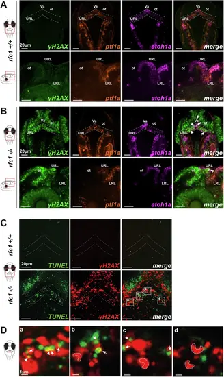 | Cerebellar neural progenitors accumulate DNA damage and undergo apoptosis in the absence of RFC1.A, B Combined immunofluorescence and RNAscope in situ hybridization for DNA damage marker γH2AX (green), ptf1a (orange), and atoh1a (magenta) at 2 dpf in rfc1+/+ (A, n = 5) and rfc1−/− (B, n = 5) embryos. Dorsal views (upper panels) and lateral views (lower panels) are shown. Dotted lines outline the upper rhombic lip (URL). ot optic tectum, LRL lower rhombic lip, Va valvula cerebelli. C Confocal images (1-μm optical slice) showing colocalization of apoptotic cells (TUNEL, green) and DNA damage (γH2AX, red) at 2 dpf in rfc1+/+ (n = 5) and rfc1-/- (n = 5) embryos. Dotted lines delineate the cerebellar region. D Higher magnification of selected regions from (C) (a–d), highlighting colocalization of TUNEL and γH2AX signals (white arrows) and characteristic γH2AX apoptotic ring patterns (dotted outlines). |
