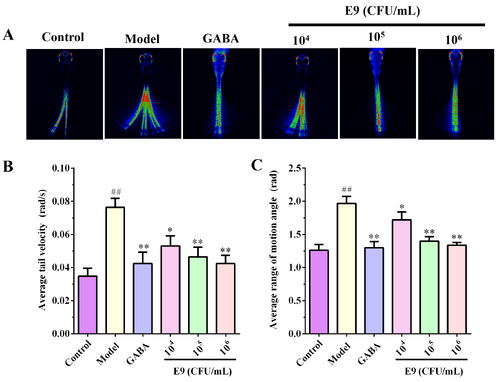 Behavioral analysis of PTZ-induced anxiety in zebrafish treated with Lactobacillus reuteri E9. (A) Representative tail movement trajectories. (B) Average tail swing angular velocity and (C) average tail swing angle of zebrafish in control, PTZ-induced model, GABA-treated, and E9-treated groups. Data are mean ± SEM (n = 15 per group). ## indicates a significant difference between the normal and model groups (p < 0.01). * indicates a comparison between the sample group and the model group, with * representing p < 0.05, and ** representing p < 0.01. GABA-treated as positive control (500 µM). PTZ (7.5 mM, 20 min) induced hyperactivity, while E9 (1% v/v, 1 h pre-treatment) reversed these effects. Behavioral tracking was performed using EthoVision XT software (Noldus). |