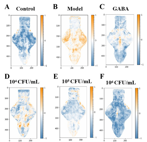 Lactobacillus reuteri E9 suppresses PTZ-induced neuronal hyperactivity in zebrafish brains. Zebrafish in (A) normal (control group), (B) PTZ-induced model (model group), (C) GABA-treated (positive group), and E9-ttreated with different concentrations (expriment groups): (D) 1 × 104 CFU/mL, (E) 1 × 105 CFU/mL and (F) 1 × 106 CFU/mL. The left part show fluorescence images of brain activity in Tg(Elavl3:H2B-GCaMP6f) zebrafish (blue: baseline activity; yellow: PTZ-induced hyperactivity). The right part present quantification of brain discharge area (normalized to control). Data are mean ± SEM (n = 8 per group). E9 treatment (1% v/v, 7 days) significantly reduced PTZ-induced neuronal excitation. Imaging parameters: 20 × objective, 488 nm excitation. |