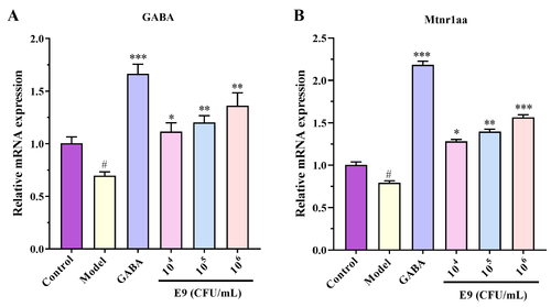 Lactobacillus reuteri E9 upregulates GABA and melatonin receptor gene expression in zebrafish. Relative mRNA levels of (A) GABA receptor and (B) melatonin receptor 1aa (Mtnr1aa) in zebrafish brains. Data are normalized to β -actin and presented as fold change (mean ± SEM, n = 12 per group). # indicates a comparison between the normal group and the model group with # representing p < 0.05, * indicates a comparison between the sample group and the model group, with * representing p < 0.05, ** representing p < 0.01, and *** representing p < 0.001. Gene expression analysis was performed via qPCR. |