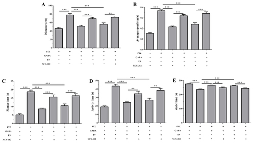 Behavioral analysis of the inhibitory effect of GABA receptor antagonist NCS-382 on the anxiolytic activity of E9 in zebrafish with PTZ-induced anxiety. (A) Total swimming distance. (B) Average swimming speed. (C) Mania time. (D) Activity time. (E) Static time(s). Data are presented as mean ± SEM (n = 24/group). **p < 0.01; ***p < 0.001. Behavioral tracking was performed using EthoVision XT software (Noldus). |