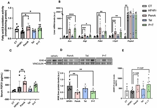 Treatment with PemA increased hepatic fatty acid oxidation. (A) Fatty acid β-oxidation activity and (B) mRNA levels of genes related to fatty acid catabolism. Serum FGF21 (C) and ANGPTL3 (E) levels from all experimental groups. (D) Relative content of KHK protein levels in liver samples, along with the representative Western Blot bands from HFHFr, PemA, Tel and P + T groups. Quantitative results are presented as bar plots with individual values, showing the mean ± SD of 6–8 animals/group. *P < 0.05, **P < 0.01, ***P < 0.001, ****P < 0.0001. |