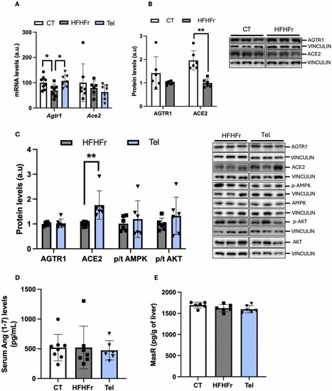 Effects of telmisartan treatment on the renin angiotensin system. (A) Relative liver Ace2 and Agtr1 mRNA levels in the livers of CT, HFHFr and CT groups. (B) Relative liver protein levels of ACE2 and AGTR1 from CT and HFHFr groups. (C) Relative liver protein levels of ACE2, AGTR1, phosphor/total AMPK and phosphor/total AKT from HFHFr and Tel groups. On the right part of the Figs. B and C, representative western blot bands corresponding to the mentioned groups. Serum Ang (1−7) (D) and MasR liver protein levels (E) from CT, HFHFr and Tel groups. Quantitative results are presented as bar plots with individual values, showing the mean ± SD of 6–8 animals/group. *P < 0.05. |