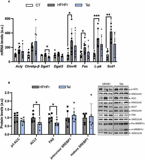 Effects of telmisartan treatment on key enzymes involved in de novo lipogenesis (DNL). Relative mRNA (A) and protein levels (B) of liver DNL markers. On the right part of the figure, representative western blot bands corresponding to HFHFr and Tel groups are shown. Quantitative results are presented as bar plots with individual values, showing the mean ± SD of 6–8 animals/group. *P < 0.05. |