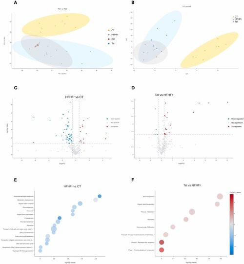 Metabolomic analysis of liver samples from CT, HFHFr Tel groups. Principal component analysis (A) and partial least squares discriminant analysis (B) showing the clustering patterns and separation of metabolic profiles from the different groups. Volcano plots highlighting significant differences (P < 0.05, |Log₂FC| > 0.5, colored) in HFHFr vs. CT (C) and Tel vs. HFHFr (D). Pathway enrichment analysis using Over-Representation Analysis with metabolites that were significantly altered (P < 0.05, |Log₂FC| > 0.5) in the HFHFr vs. CT (E) and Tel vs. HFHFr (F) comparisons. Dot size is proportional to the number of hits per pathway. |